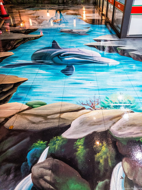 By this time it had grown dark, and started drizzling a bit. I threw on my jacket, which has a hood, we grabbed the flashlight from the room (they really give you everything), and let Teresa take my portable umbrella - but it turned out that there were much nicer umbrellas to borrow at the lobby, so we grabbed those. We stopped at the front desk to ask directions, and here we got the bad news - the convenient pedestrian bridge we had been depending on for access to the town was closed for maintenance, and we would need to walk another estimated 20 minutes down the street to take the car bridge instead, forcing us to head in completely the wrong direction before looping back into town. No taxis or shuttles could be booked; a taxi would need to come from a city an hour away and be very pricey. But at this point, we were committed, we needed food, we had no reservations, and we had to go into the town to get to any restaurants. At least the route seemed relatively easy to follow, and I had google maps up on my phone. A bit daunted, but nevertheless confident that it wouldn’t be too much extra effort--and not having much choice at this point--we set forth.